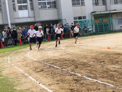 2年生徒競走。カーブを上手に回ります。