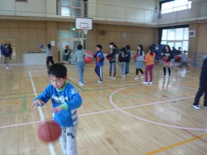 バスケットボールでシュートをしたりドリブルをしたり、ボールの取り合いをしたりしていました。