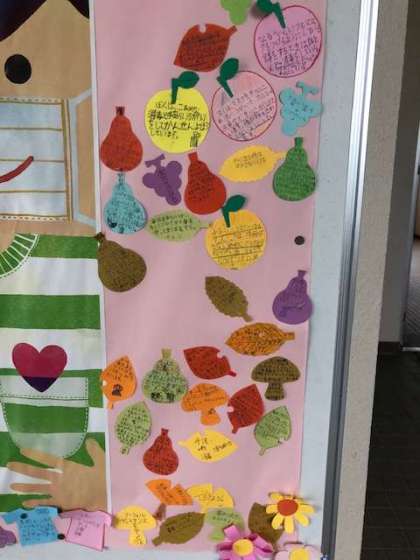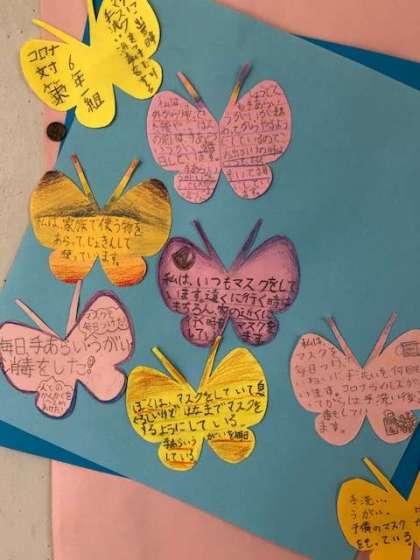 保健室横の掲示板です。子ども達が自ら行なっている感染症対策が、数多く掲示されています。