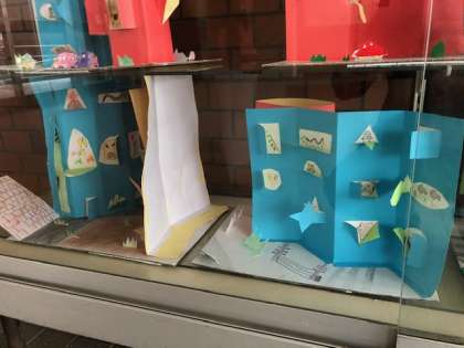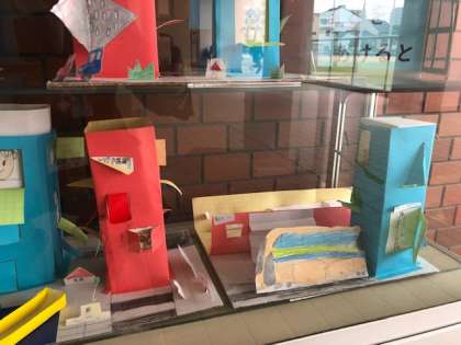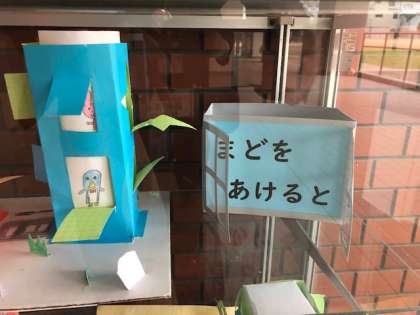 今月は2年生の図工作品を玄関に展示しています。「まどをあけると」というタイトルで、窓の中をのぞくと素敵な景色が見えるという世界を表現しています。