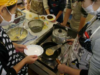 続いて、おやつ作りということで、パンケーキを焼きました。