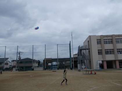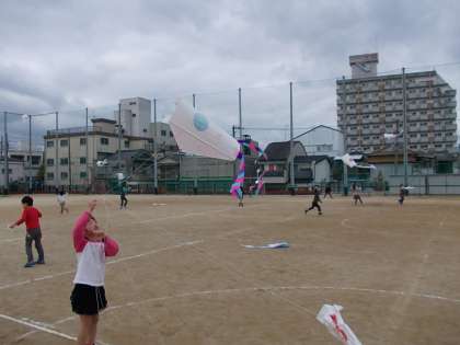 5時間目に生活科で作った「ビニールだこ」を運動場で揚げました。思い思いの絵が描いてある自慢の「たこ」を走り回って揚げていました。高く揚がったたこもたくさんありました。途中、友だちのたこと糸が絡まってしまい、糸をほどくのに時間がかかったこともありました。しかし、みんな元気に走り回って楽しそうでした。
