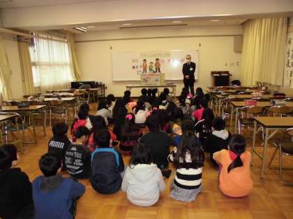 大阪府、少年サポートセンターの方々2名が連携して、ペープサートを見ました。劇を通して非行や犯罪被害を防止し子どもたちの健全育成の取り組みです。5年生のみんなは静かに真剣な眼差しで聞いていました。