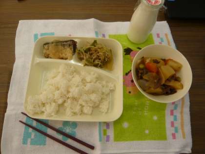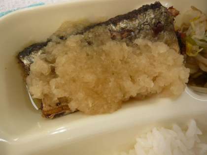 今日の給食、献立は、さんまのみぞれかけ、牛肉とじゃがいもの煮物、野菜のいためもの、ごはん、牛乳です。