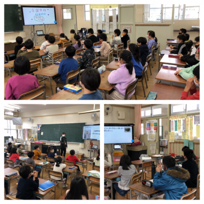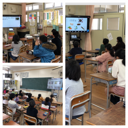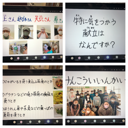 どの教室でも、画面にくぎ付けになりながら、給食調理員さんのお話に聞き入っていました。