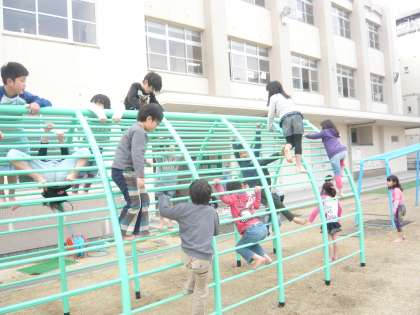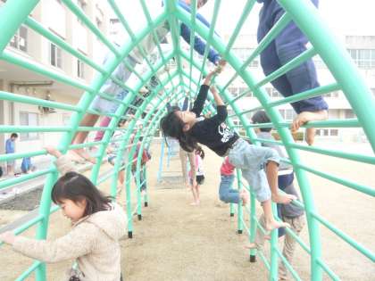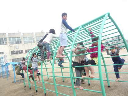 子どもたちは、珍しさもあり思い思いにぶら下がったり、よじのぼったり、通り抜けたりしています。