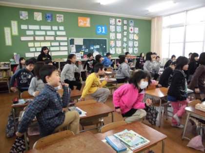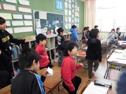 その後、先日、紹介した「ファンキーのびのびたいそう」(立って行う姿勢体操)をしました。子どもたちは、笑顔いっぱいでノリノリたいそうでした。