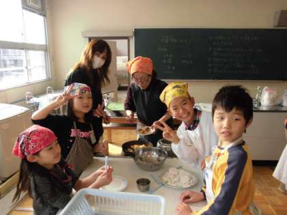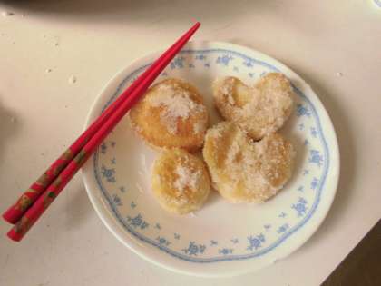 材料は、もち粉・お湯・ごま油・はちみつです。こねてこねて、まるめてまるめていました。