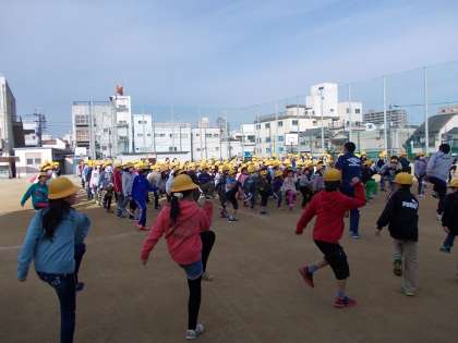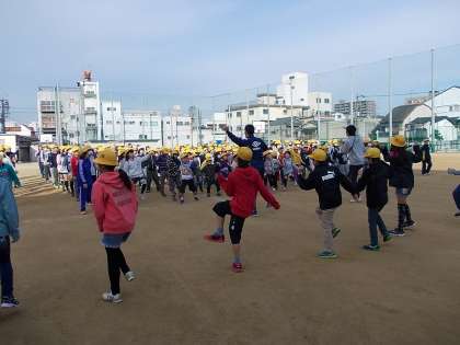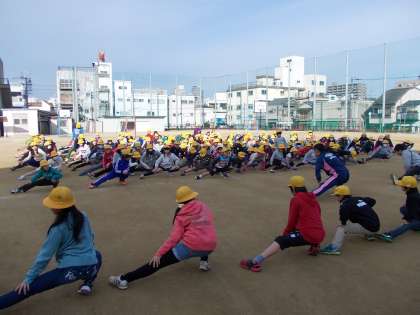 朝会に続いて、ノビノビファンキー体操です。健康委員会の子どもたちが前に出て見本を見せてくれました。