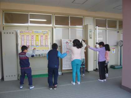 保健室前にノビノビファンキーたいそうの動きの表が掲示されており、子どもたちは、音楽に合わせて体操をしているのでした。