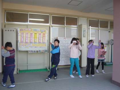 休み時間、保健室前でノビノビファンキーたいそうにチャレンジしている子どもたちを見つけました。