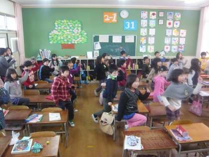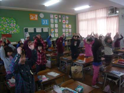 子どもたちからのリクエストもあり、本校の姿勢体操である「ファンキーノビノビたいそう」にチャレンジしました。