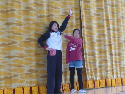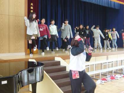 交流会に続いて、健康委員会児童が東桃谷小学校の姿勢体操である「ノビノビファンキーたいそう」を紹介しました。