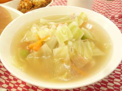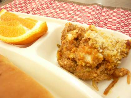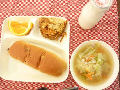 献立は、とうふのミートグラタン、麦と野菜のスープ、デコポン、レーズンパン、牛乳です。
