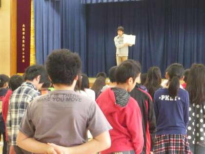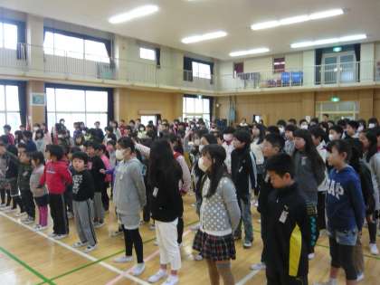 全校児童が、8時30分のチャイムが鳴る前に講堂に集まっていました。