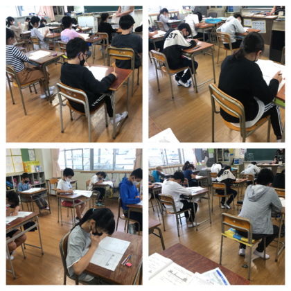 今日は、6年生と5年生が、全国学力・学習状況調査と小学生すくすくテストに挑戦しました。時間いっぱい最後まで頑張りました。