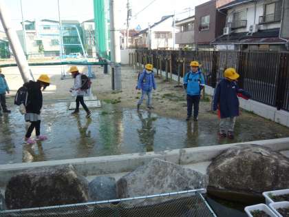 校舎の陰の水たまりや運動場のバケツの水が凍っていました。