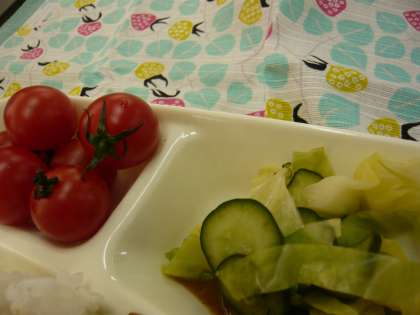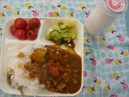 献立は、ポークカレーライス、グリーンサラダ、プチトマト、牛乳です。