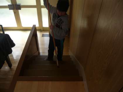 広い床面だけでなく、掃除しにくい階段のほこりもていねいに掃除しています。