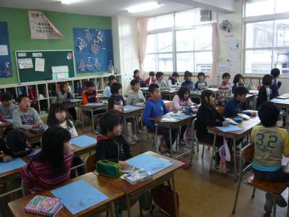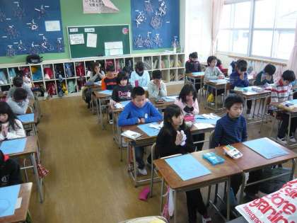 4年生の教室へ行くと、黙とうについての放送を聴いているところでした。