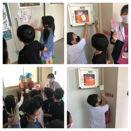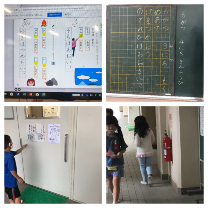1年生が国語科の学習で、「○○は〜」という助詞を学習しました。「は」の札を持って学校中を歩き、「○○は」が当てはまるものを探しました。
