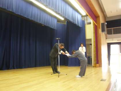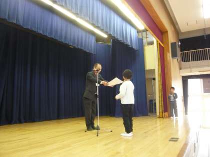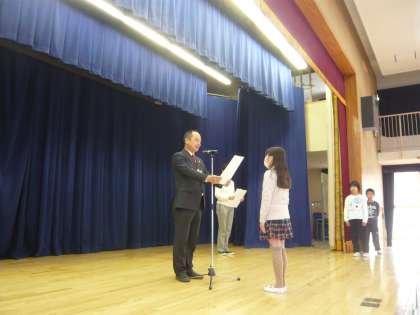 各学級の代表児童に賞状を授与しました。
