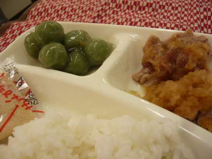 献立は、豚肉のおろしじょうゆかけ、五目汁、きな粉よもぎだんご、ごはん、牛乳でした。