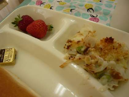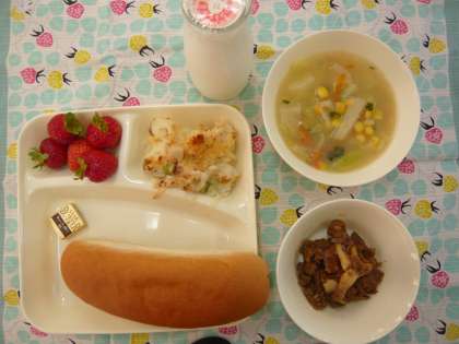 ビーフチャップ、ホタテ貝のグラタン、コーンスープ、いちご、パン、バター、牛乳です。