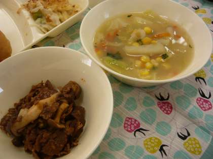 いつもより品目が多いので、特別に小椀も使っています。(ビーフチャップ)