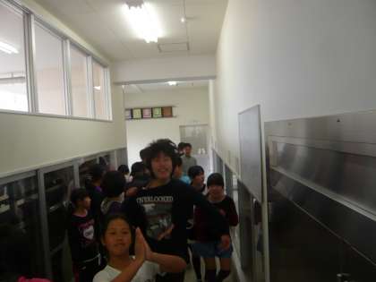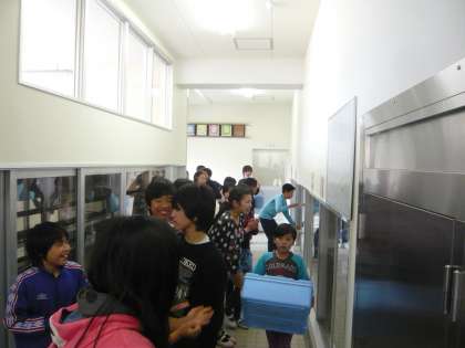 6年生が最後の給食を終えて、食器や食缶等を全員で返却にきました。