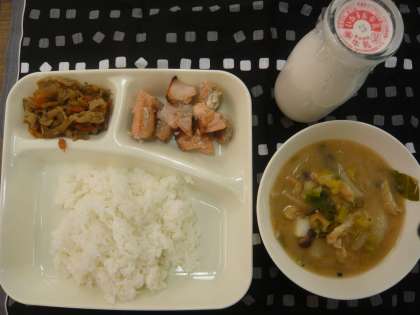 献立は、さけの香味焼き、みそ汁、きんぴらごぼう、ごはん、牛乳です。