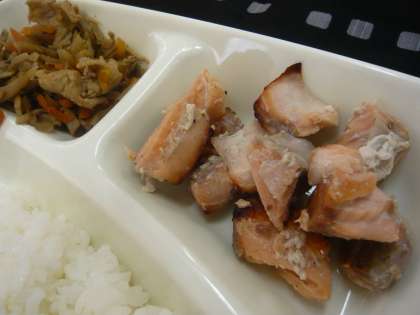 さけは、焼くまでにしょうが汁、料理酒、みりん、塩、さんしょうで下味をつけています。風味豊かな、ワンクラス上のさけの香味焼きをおいしくいただきました。