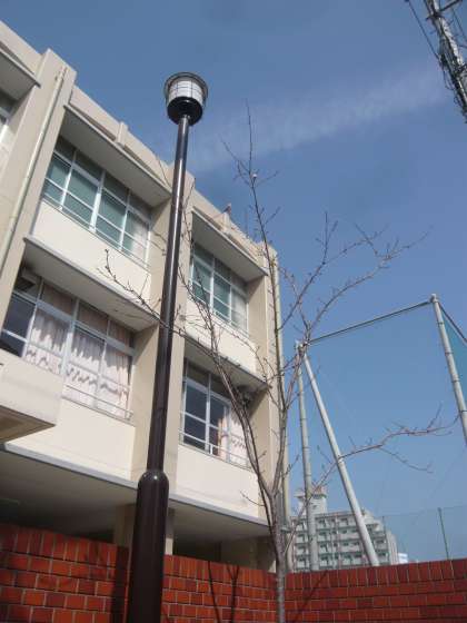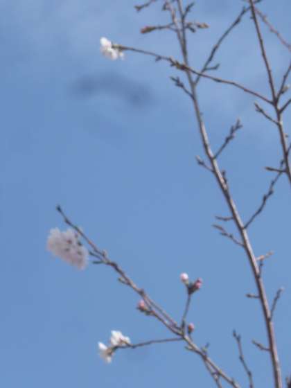 正門横の桜は、まだ若木で、ちらほらと花芽をつけておりましたが、咲き始めております。