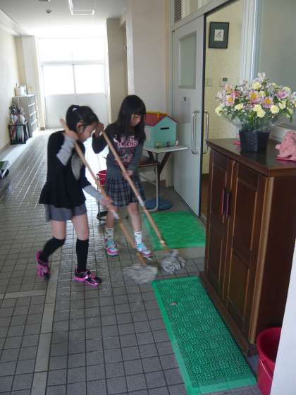 いきいき活動に参加している3年生女子児童2名が、職員室から校長室前にかけて掃除をしてくれました。その後、女子トイレもきれいに掃除をしてくれたそうです。