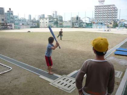 芝生では、ベースボール型のゲームを楽しんでいました。