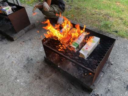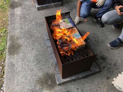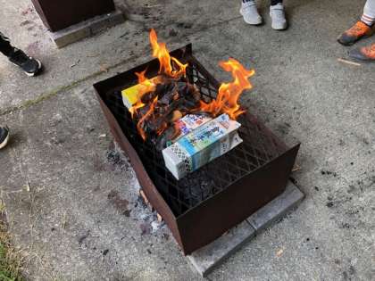 牛乳パックの炎で中のパンが温められます