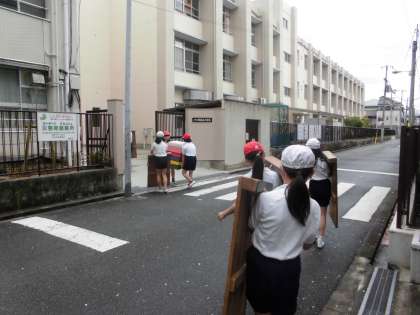 今朝、6年生が講堂に跳び箱、マット、ボールなどをプール棟や講堂2階から運び入れてくれました。