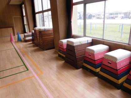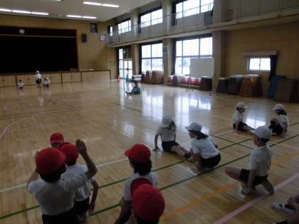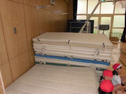 6年生が跳び箱などをきちんと運び入れてくれた後、講堂では体育の授業が続きました。