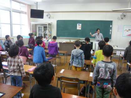 2年1組、1年1組を訪れたときは読書タイムが終わっており、朝の会が始まっていました。