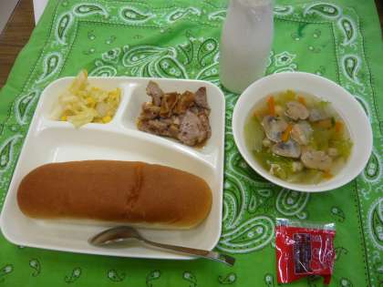 献立は、豚肉のデミグラスソース、レタスのスープ、サワーソテー、パン、牛乳、いちごジャムでした。