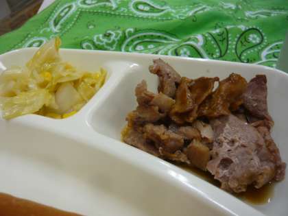 りんごピューレ、デミグラスソース、ウスターソース、ケチャップを合わせて煮て、最後に焼かれた豚肉にからめています。奥の深い味わいでした。レタスのスープ、サワーソテーはさっぱりとした味わいで、豚肉のデミグラスソースと合わせてとてもおいしくいただきました。
