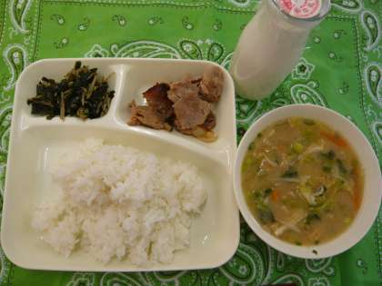 献立は、豚肉の甘辛焼き、みそ汁、じゃこわかめ、ごはん、牛乳でした。