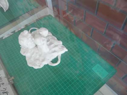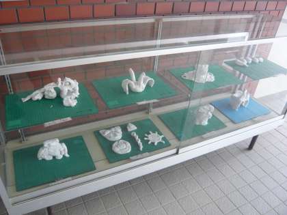 玄関にある児童作品を展示するケースに1年生の粘土でつくった作品が展示されています。