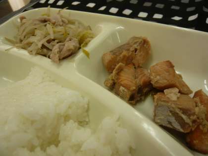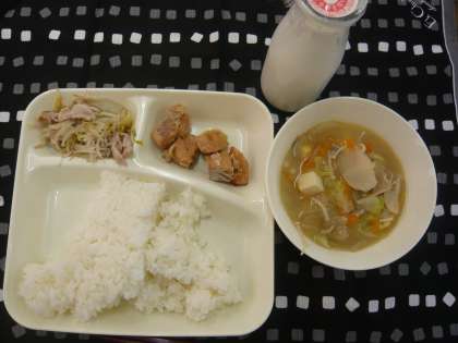 献立は、さけのつけ焼、みそ汁、もやしの炒め物、ごはん、牛乳でした。