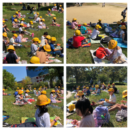 昼食は公園でお弁当でした。少し天気が良すぎたようですが、みんなおいしくいただきました。