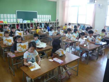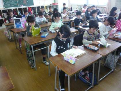 4年生、2年生の教室では、家から持ってきた本や国語の教科書を読んだりしていました。