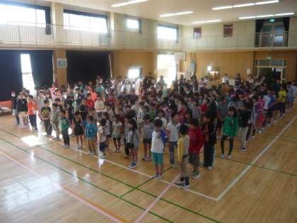 児童集会で集まってきたときの様子と、途中で話を聴いているときの姿勢です。