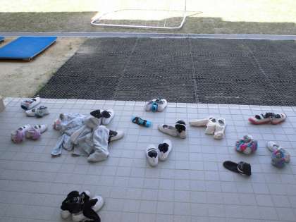 休み時間になると子どもたちは、裸足になって芝生で思い思いに遊んでいます。