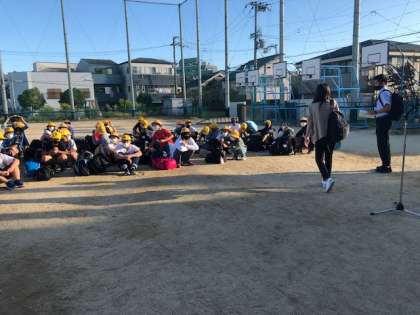 さあ修学旅行の朝です。6年生の子ども達が集まってきました。まもなく出発式です。