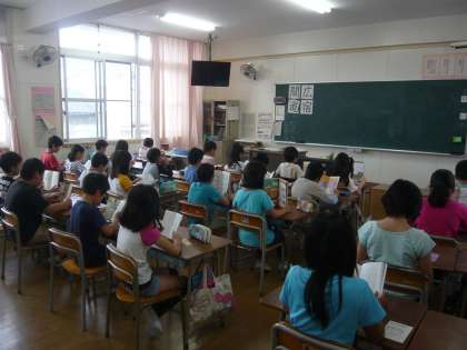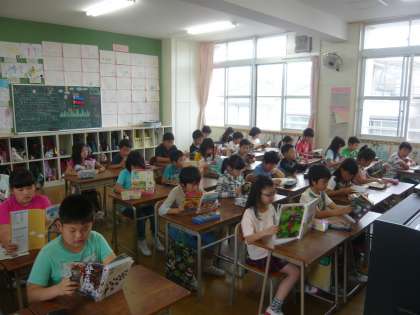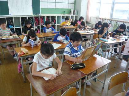 4年生、3年生の教室では、担任が教室に行くまでに子どもたちは読書に集中していました。